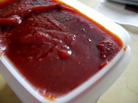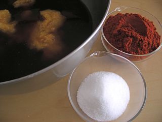作り方は簡単。1〜4をミキサーで混ぜて、弱火で鍋で煮る。今回は、ハンディーミキサー(貝印)を使ってみた。沸いてきたら唐辛子、最後にグラ ニュー糖を加えてよくまぜるだけ。唐辛子はダマになりやすいのが、つやが出るまでがんばって混ぜる。コチュジャンを使ったレシピは上記の本などを参考に。